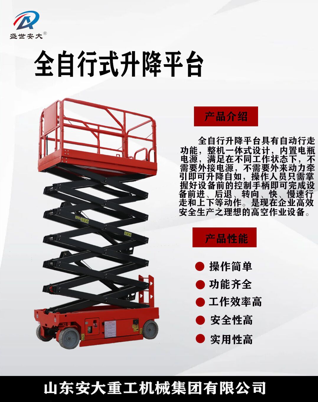 山東安大重工機(jī)械集團(tuán)有限公司是一家集研發(fā)、生產(chǎn)、銷售液壓升降平臺(tái)的廠家。生產(chǎn)設(shè)備先進(jìn),技術(shù)力量雄厚,外形美觀,設(shè)計(jì)新穎、結(jié)構(gòu)合理、升降平穩(wěn)、操作簡單、維修方便等優(yōu)點(diǎn)。