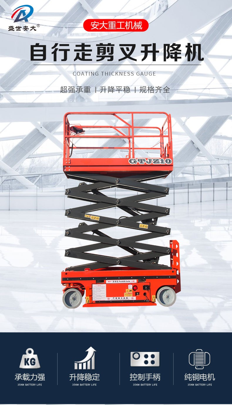 全自行式:自行式升降平臺具有自動行走功能,內(nèi)置電瓶電源,操作人員只需掌握好設(shè)備前的控制手柄就能完成前進(jìn)、后退、轉(zhuǎn)向、快、慢速行走和上下等動作,自行剪叉式升降平臺移動靈活,操作方便、省工、省力令高空作業(yè)更方便快捷。